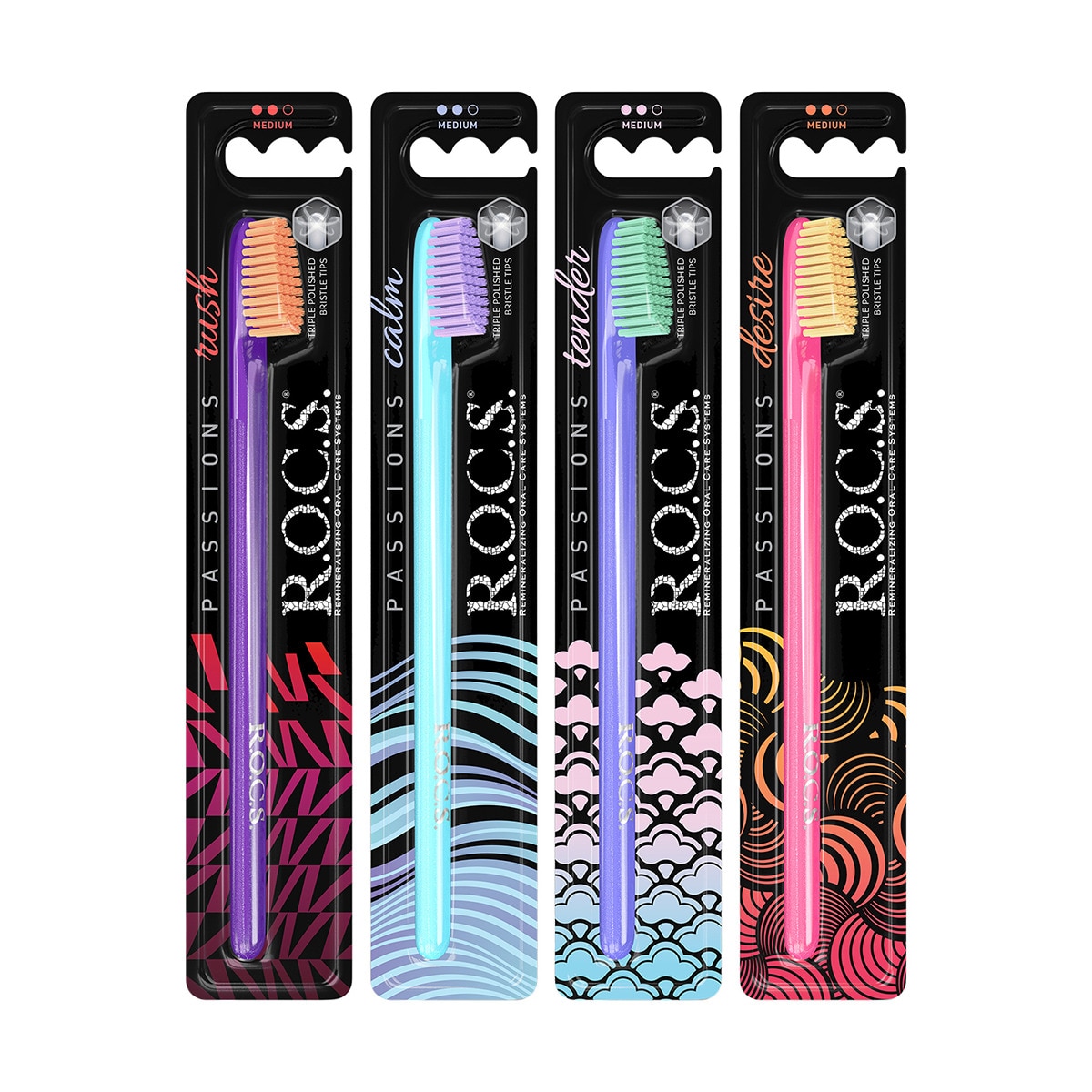 Rocs, passions diş fırçaları ile diş fırçalama rutinine heyecan ve duygu dolu renkler katmak amaçladı. Eğilimli fırça kılı sayesinde arka dişlere kolayca ulaşır ve etkili temizlik sağlar. Ekstra yuvarlatılmış ve pürüzsüz kıl uçları diş ve dişeti dokularına zarar vermeden temizler. İnce ve zarif sap tasarımı, diş ve dişetlerine uygulanabilecek fazla basıncı engeller. Diş fırça kılları düz değildir. Özel zincir dokusu sayesinde kılların temizlik özelliği çok daha yüksektir. Farklı renk kombinasyonu sayesinde sizin de banyonuzdaki vazgeçilmeziniz olacaktır