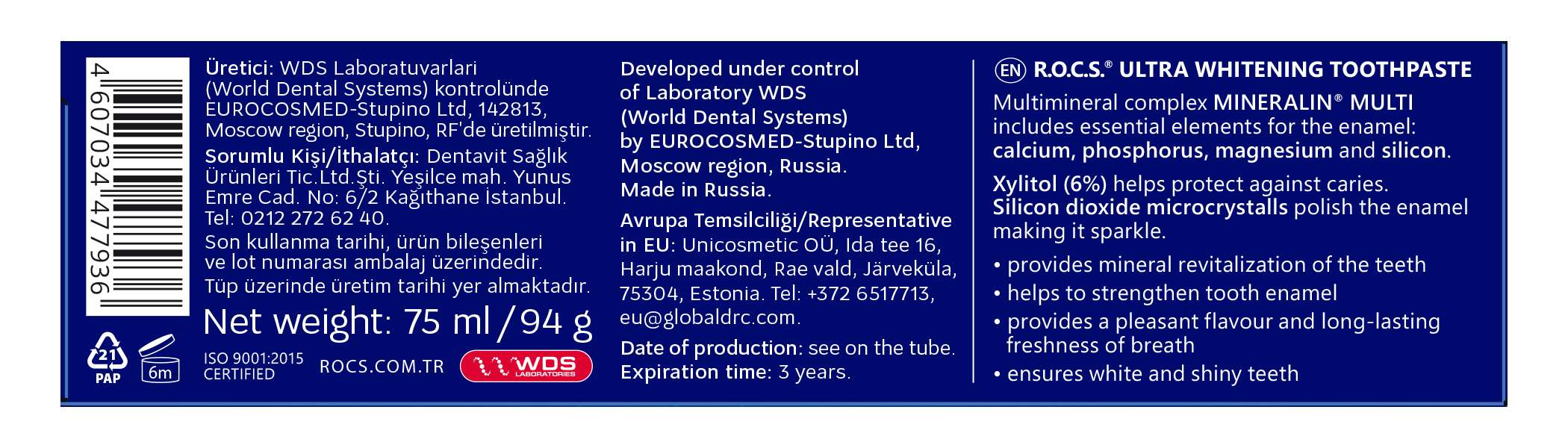 R.O.C.S. Ultra Beyazlatıcı Diş Macunu, diş minesinin rengini açmak, beslemek ve remineralize etmek için geliştirilmiştir.