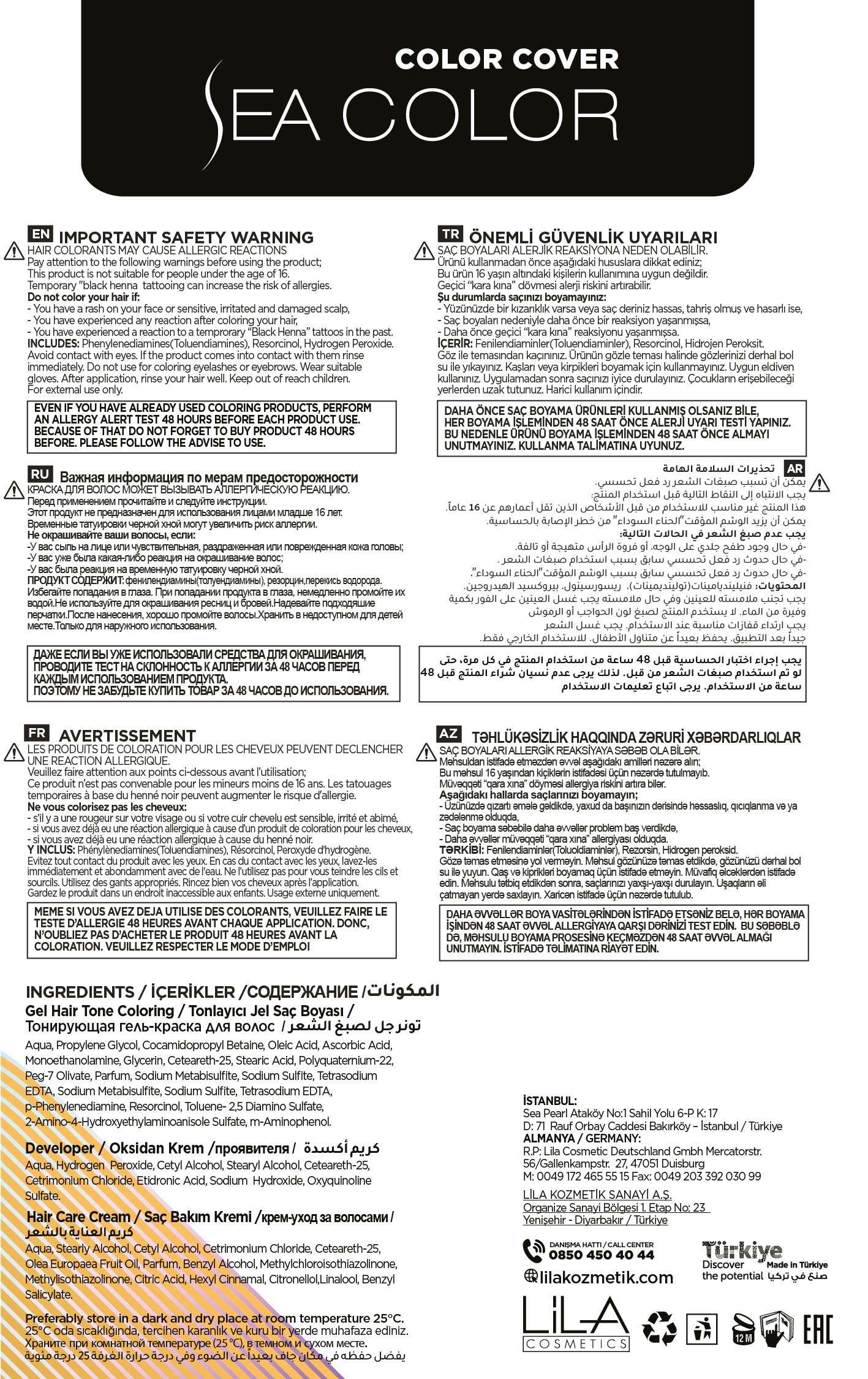 ÖNEMLİ GÜVENLİK UYARILARI SAÇ BOYALARI ALERJİK REAKSİYONA NEDEN OLABİLİR. Ürünü kullanmadan önce aşağıdaki hususlara dikkat ediniz; Bu ürün 16 yaşın altındaki kişilerin kullanımına uygun değildir. Geçici “kara kına” dövmesi alerji riskini artırabilir. Şu durumlarda saçınızı boyamayınız: - Yüzünüzde bir kızarıklık varsa veya saç deriniz hassas, tahriş olmuş ve hasarlı ise, - Saç boyaları nedeniyle daha önce bir reaksiyon yaşanmışsa, - Daha önce geçici “kara kına” reaksiyonu yaşanmışsa. İÇERİR: Fenilendiaminler(Toluendiaminler), Resorcinol, Hidrojen Peroksit. Göz ile temasından kaçınınız. Ürünün gözle teması halinde gözlerinizi derhal bol su ile yıkayınız. Kaşları veya kirpikleri boyamak için kullanmayınız. Uygun eldiven kullanınız. Uygulamadan sonra saçınızı iyice durulayınız. Çocukların erişebileceği yerlerden uzak tutunuz. Harici kullanım içindir.DAHA ÖNCE SAÇ BOYAMA ÜRÜNLERİ KULLANMIŞ OLSANIZ BİLE, HER BOYAMA İŞLEMİNDEN 48 SAAT ÖNCE ALERJİ UYARI TESTİ YAPINIZ. BU NEDENLE ÜRÜNÜ BOYAMA İŞLEMİNDEN 48 SAAT ÖNCE ALMAYI UNUTMAYINIZ. KULLANMA TALİMATINA UYUNUZ.