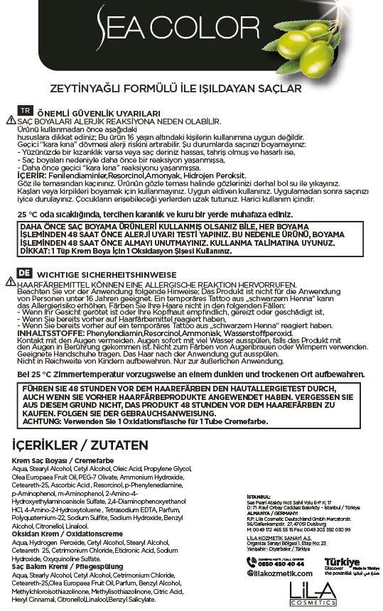 Krem Saç Boyası / CremefarbeAqua, Stearyl Alcohol, Cetyl Alcohol, Oleic Acid, Propylene Glycol, Olea Europaea Fruit Oil, PEG-7 Olivate, Ammonium Hydroxide, Ceteareth-25, Ascorbic Acid , Resorcinol, p-Phenylenediamine, p-Aminophenol, m-Aminophenol, 2-Amino-4-Hydroxyethylaminoanisole Sulfate, 2,4-Diaminophenoxyethanol HCI, 4-Amino-2-Hydroxytoluene , Tetrasodium EDTA, Parfum, Polyquaternium-22, Sodium Sulfite, Sodium Hydroxide, Benzyl Alcohol, Citronellol, Linalool.Oksidan Krem / OxidationscremeAqua, Hydrogen Peroxide, Cetyl Alcohol, Stearyl Alcohol, Ceteareth 25, Cetrimonium Chloride, Etidronic Acid, Sodium Hydroxide, Oxyquinoline Sulfate.Saç Bakım Kremi / PflegespülungAqua, Stearly Alcohol, Cetyl Alcohol, Cetrimonium Chloride, Ceteareth-25,Olea Europaea Fruit Oil, Parfum, Benzyl Alcohol, Methylchloroisothiazolinone, Methylisothiazolinone, Citric Acid, Hexyl Cinnamal, Citronellol,Linalool,Benzyl Salicylate.