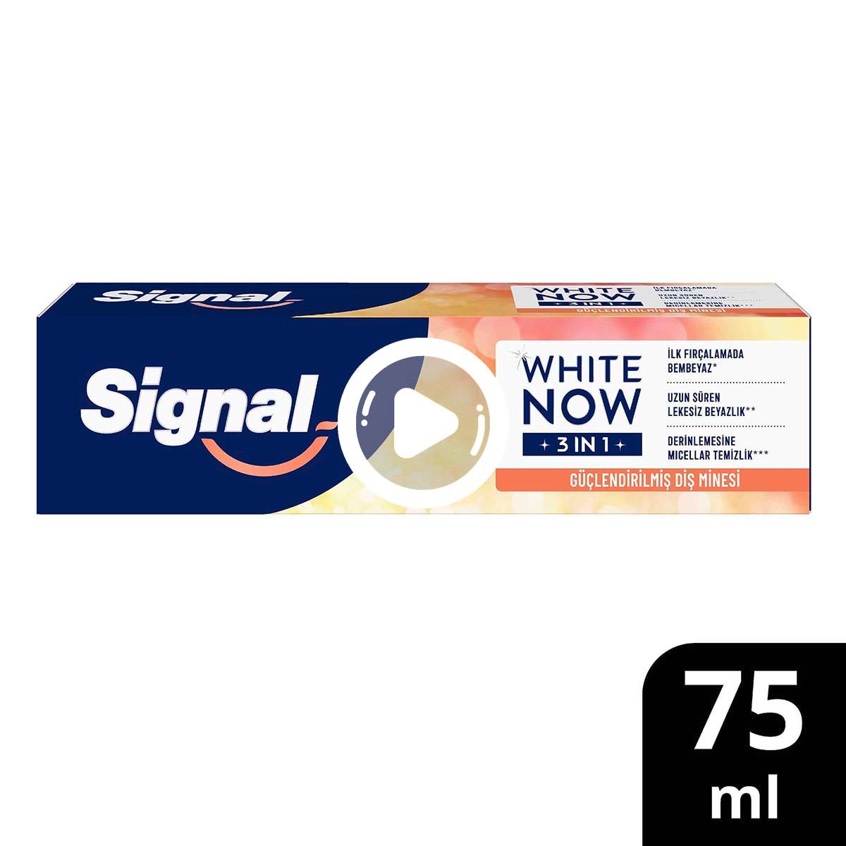 Signal White Now 3in1 Shine With Care, diş minesini güçlendirir. İlk fırçalamada anında* ve uzun süreli lekesiz** beyazlık sunar ve micellar teknolojisiyle diş minesini aşındırmadan derinlemesine*** temizler.