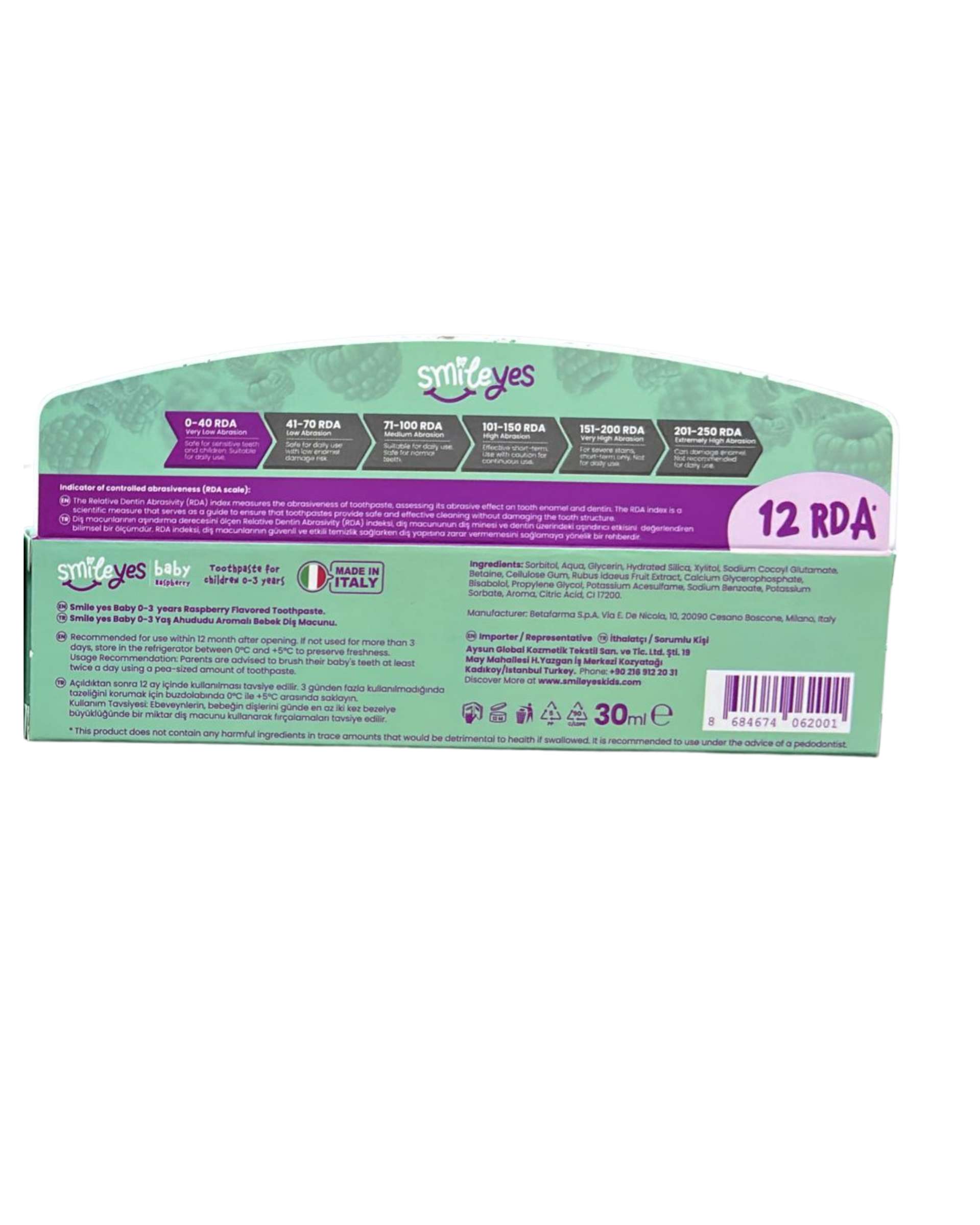 Süt dişlerini nazikçe temizlemeye yardımcı olur. Düşük aşındırıcılık seviyesi (RDA 12) ile minenin korunmasına destek olur. Florür ve SLS içermez; günlük kullanımda nazik temizlik sağlar. Ahududu aroması, düzenli fırçalama alışkanlığının kazanılmasına yardımcı olur. SGS bağımsız akredite labaratuar testi toksikolojik değerlendirmeye göre “yutulduğunda güvenli” kabul edilir; İtalya’da formüle edilip üretilmiştir.