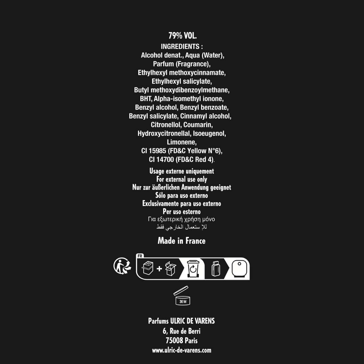 Alcohol denat., Aqua (Water), Parfum (Fragrance), Ethylhexyl methoxycinnamate, Ethylhexyl salicylate, Butyl methoxydibenzoylmethane, BHT, Alpha-isomethyl ionone, Benzyl alcohol, Benzyl benzoate, Benzyl salicylate, Cinnamyl alcohol, Citronellol, Coumarin, Hydroxycitronellal, Isoeugenol, Limonene, CI 15985 (FD&C Yellow N°6), CI 14700 (FD&C Red 4).