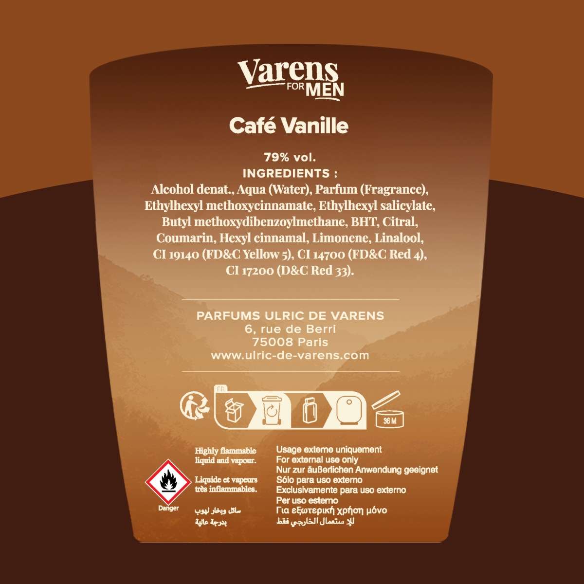 Varens For Men kahveli erkek parfümü Cafe Vanille, derin kahve notalarının sandal ağacı ve lavantayla buluştuğu elegant bir deneyim sunar.