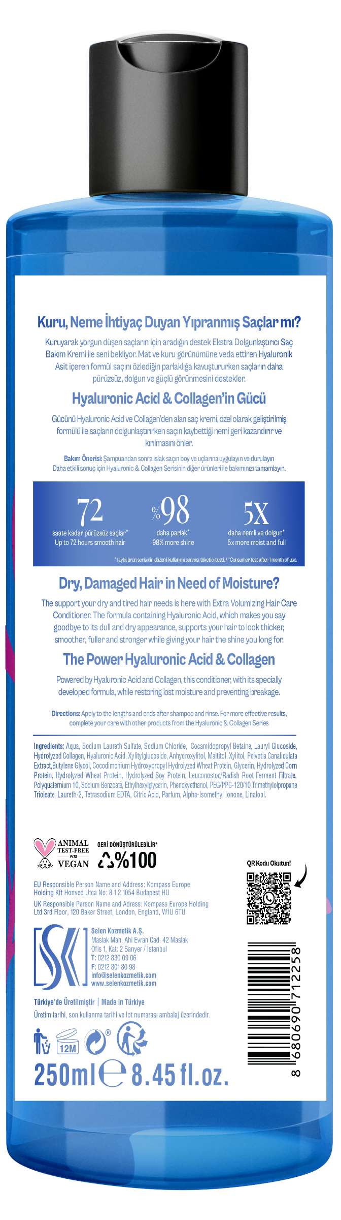 Şampuandan sonra ıslak saçın boy ve uçlarına uygulayın ve durulayın. Daha etkili sonuç için Hyaluronic & Collagen Serisinin diğer ürünleri ile bakımınızı tamamlayın.