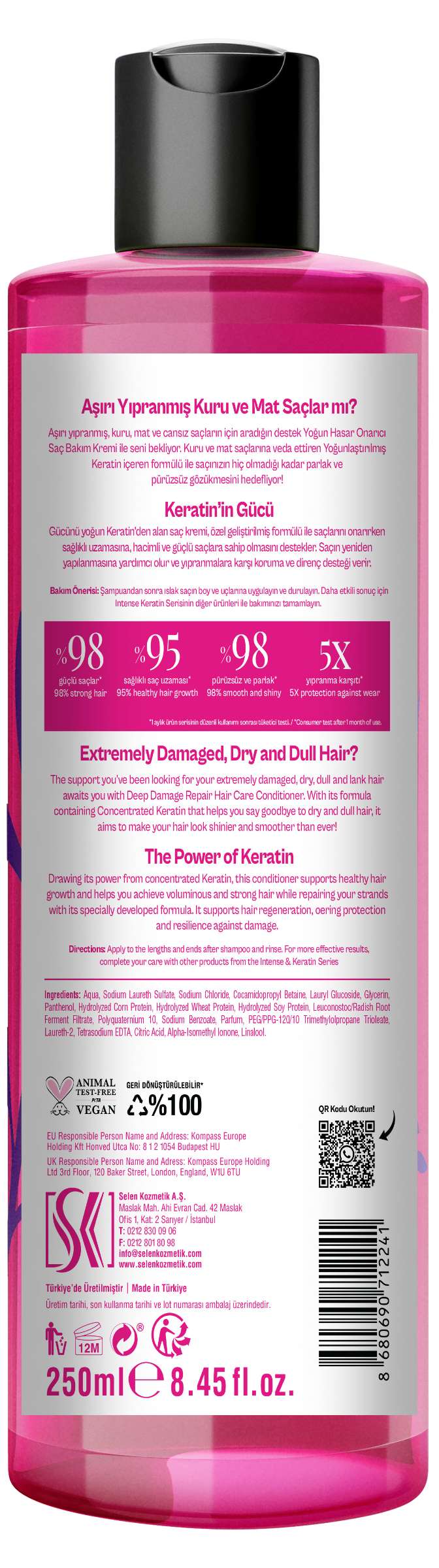 Şampuandan sonra ıslak saçın boy ve uçlarına uygulayın ve durulayın. Daha etkili sonuç için Intense Keratin Serisinin diğer ürünleri ile bakımınızı tamamlayın.