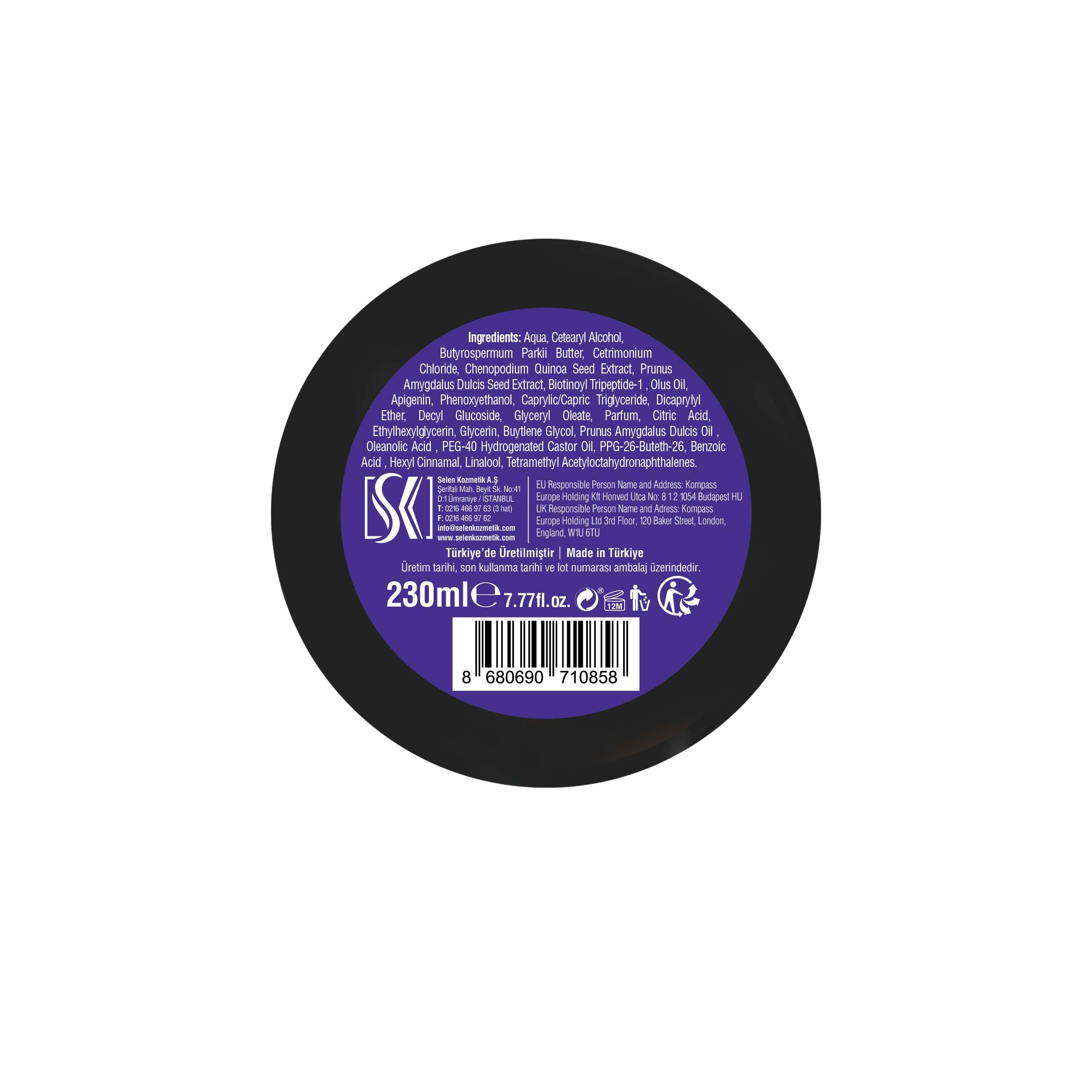 Aqua, Cetearyl Alcohol, Butyrospermum Parkii Butter, Cetrimonium Chloride, Chenopodium Quinoa Seed Extract, Prunus Amygdalus Dulcis Seed Extract, Biotinoyl Tripeptide-1 , Olus Oil, Apigenin, Phenoxyethanol, Caprylic/Capric Triglyceride, Dicaprylyl Ether, Decyl Glucoside , Glyceryl Oleate, Parfum, Citric Acid, Ethylhexylglycerin, Glycerin, Buytlene Glycol, Prunus Amygdalus Dulcis Oil , Oleanolic Acid , PEG-40 Hydrogenated Castor Oil, PPG-26-Buteth-26, Benzoic Acid , Hexyl Cinnamal, Linalool, Tetramethyl Acetyloctahydronaphthalenes.