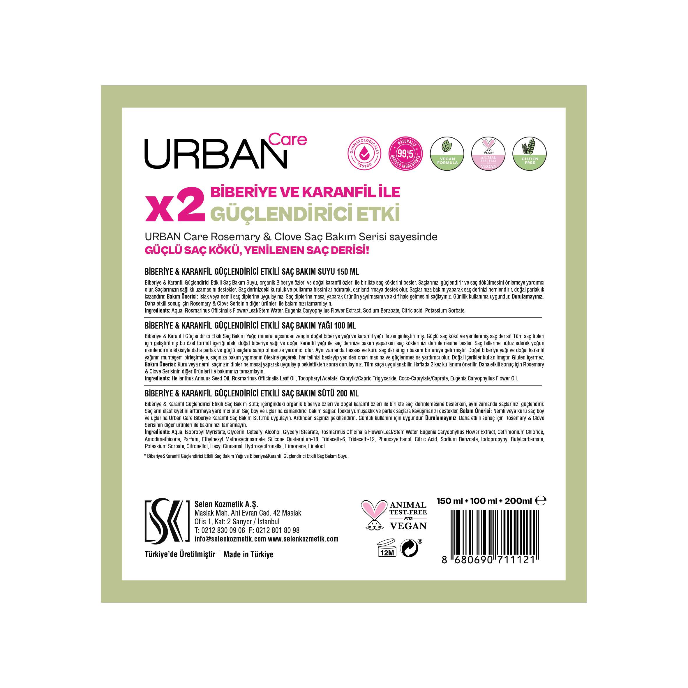 URBAN Care Rosemary & Clove Saç Bakım Seti, biberiye ve karanfil özleri ile saç derisini besleyerek daha sağlıklı, güçlü ve parlak saçlara ulaşmanıza yardımcı olur. Set içeriğindeki Saç Bakım Suyu, Saç Bakım Yağı ve Saç Bakım Sütü, saçları ağırlaştırmadan besler, saç derisini canlandırır ve saçların doğal uzama sürecini destekler.