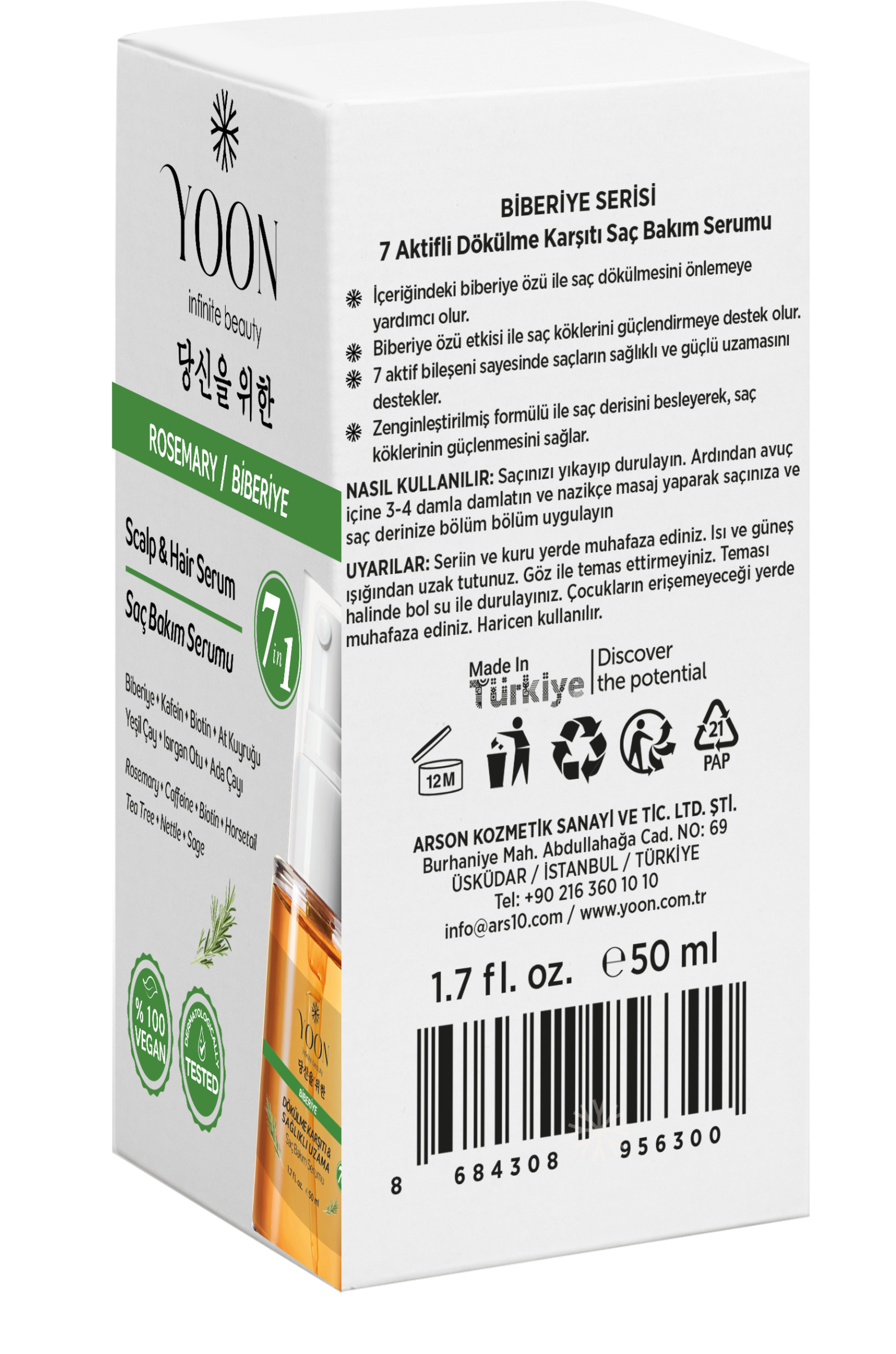 YOON Saç ve Saç Derisi Serumu, saç dökülmesini önlemeye yardımcı olurken saçların daha hızlı ve sağlıklı uzamasını destekler. İçeriğinde yer alan biberiye özü ve diğer 6 doğal aktif bileşen, saç köklerini besler ve saç tellerini güçlendirir. Aynı zamanda saç derisini yatıştırır ve dengeler. Vegan ve silikon içermeyen yapısıyla saçınıza zarar vermeden bakım yapar.